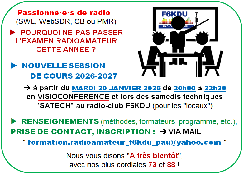 Il y aura également le lancement de la nouvelle campagne de formation à l’examen radioamateur qui débutera le mardi 20 janvier à 20h.